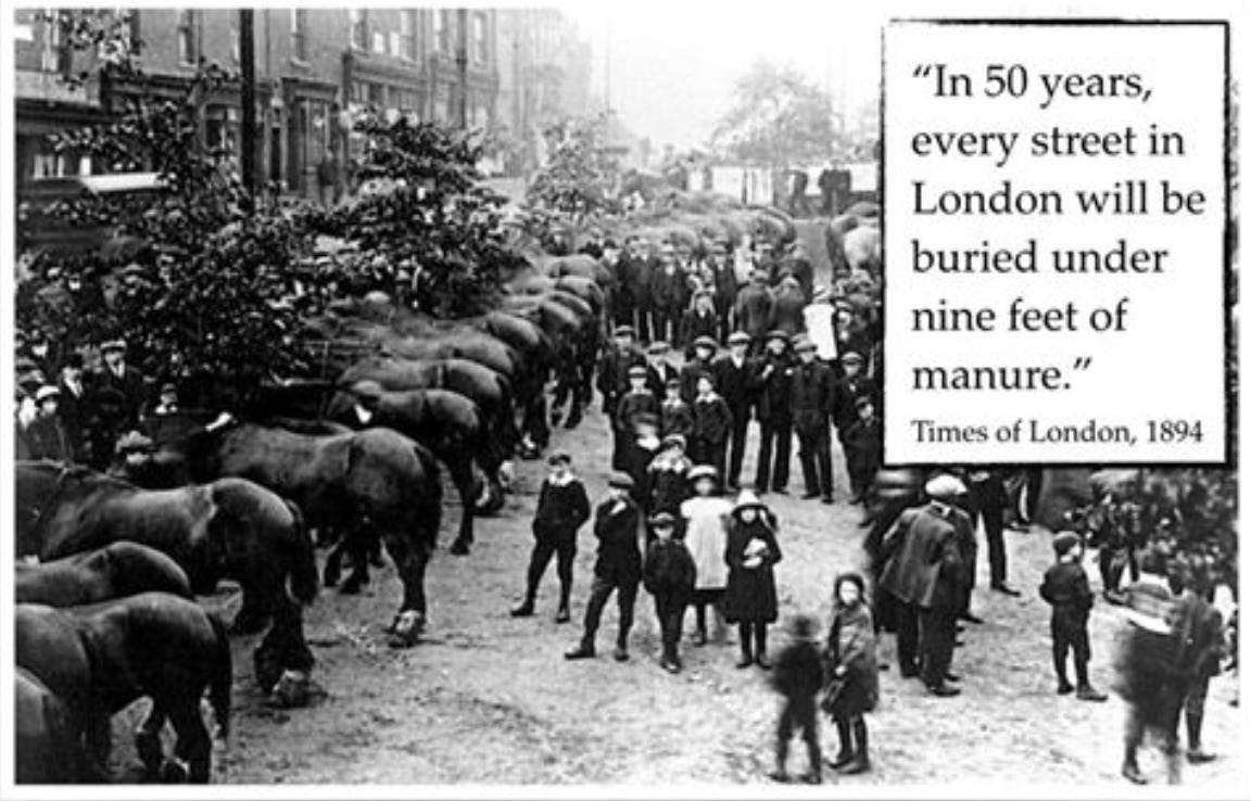 This is nothing new. “In 50 years, every street in London will be buried under nine feet of manure,” wrote The Times in 1894. In the 19th century, cities like London relied on horses for transportation, causing concerns due to excessive manure production. The crisis seemed unsolvable until innovators like Henry Ford introduced affordable motor cars. By 1912, horses were no longer the primary transport in urban areas.